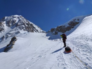 hostile par les conditions physiques éprouvantes et prolongées de l’ascension, pendant 10 à 12 jours de marche en neige poudreuse parfois profonde. Le véritable alpinisme ne commence malheureusement qu’au camp 3, à 4328 mètres avec seulement le sac à dos (bien chargé aussi).