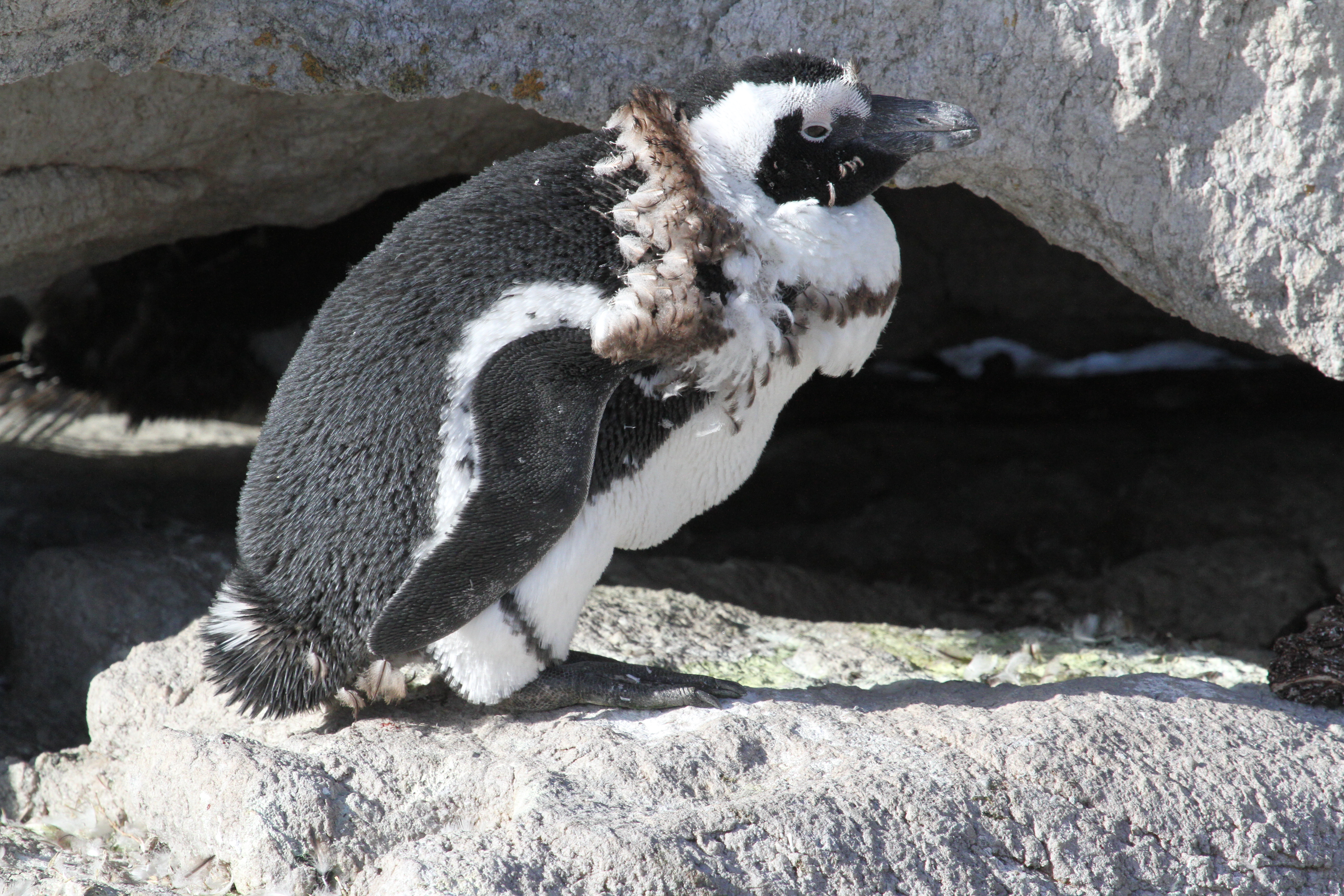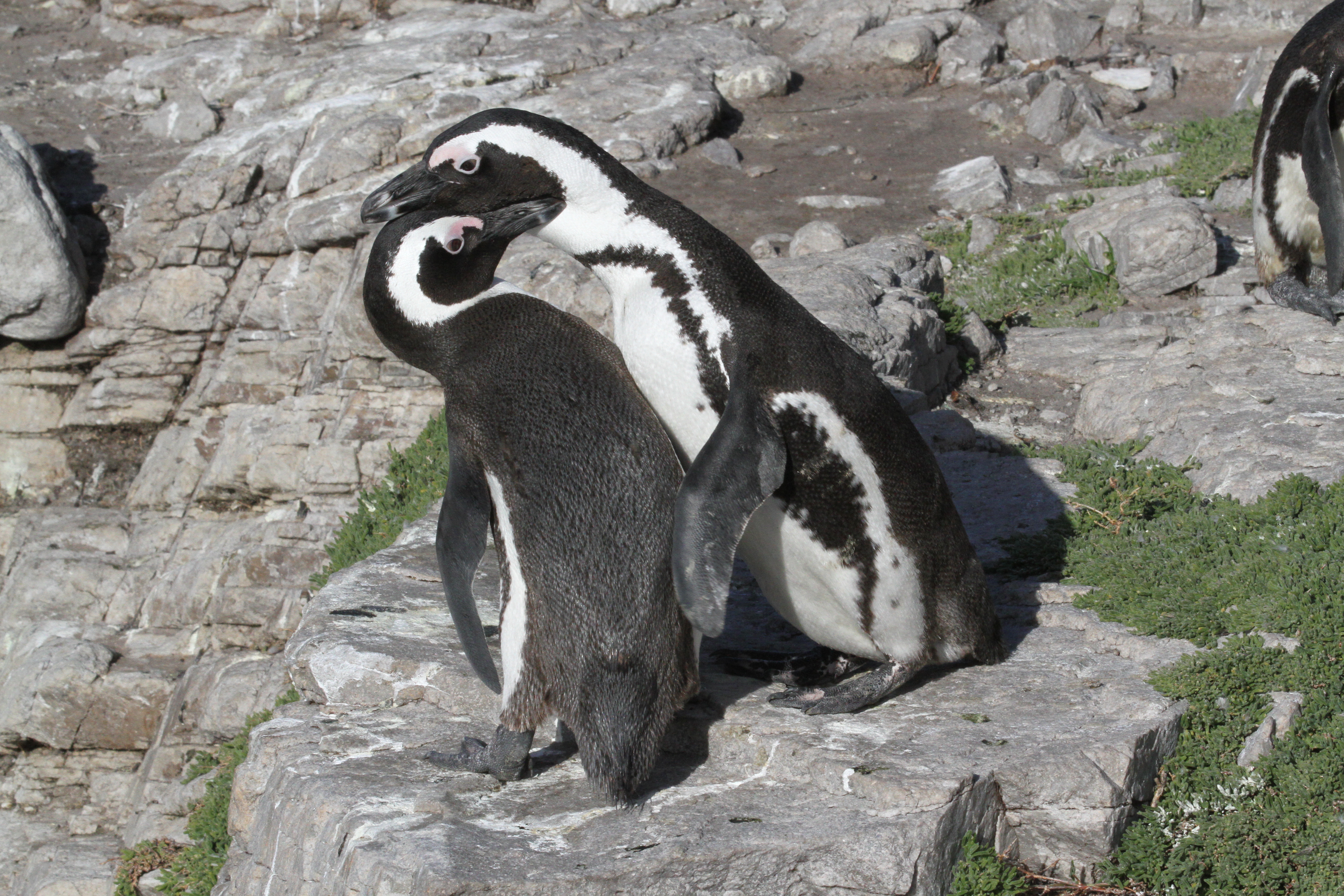 Direction Betty’s Bay et les manchots du Cap, une nouvelle colonie qui aime les rochers et cohabite avec des cormorans. Plus calmes qu’hier, peut-être à cause du vent violent qui s’est levé. Des jeunes moins jeunes, certains manchots muent…. Des jeunes demandent la becquée… Cool !